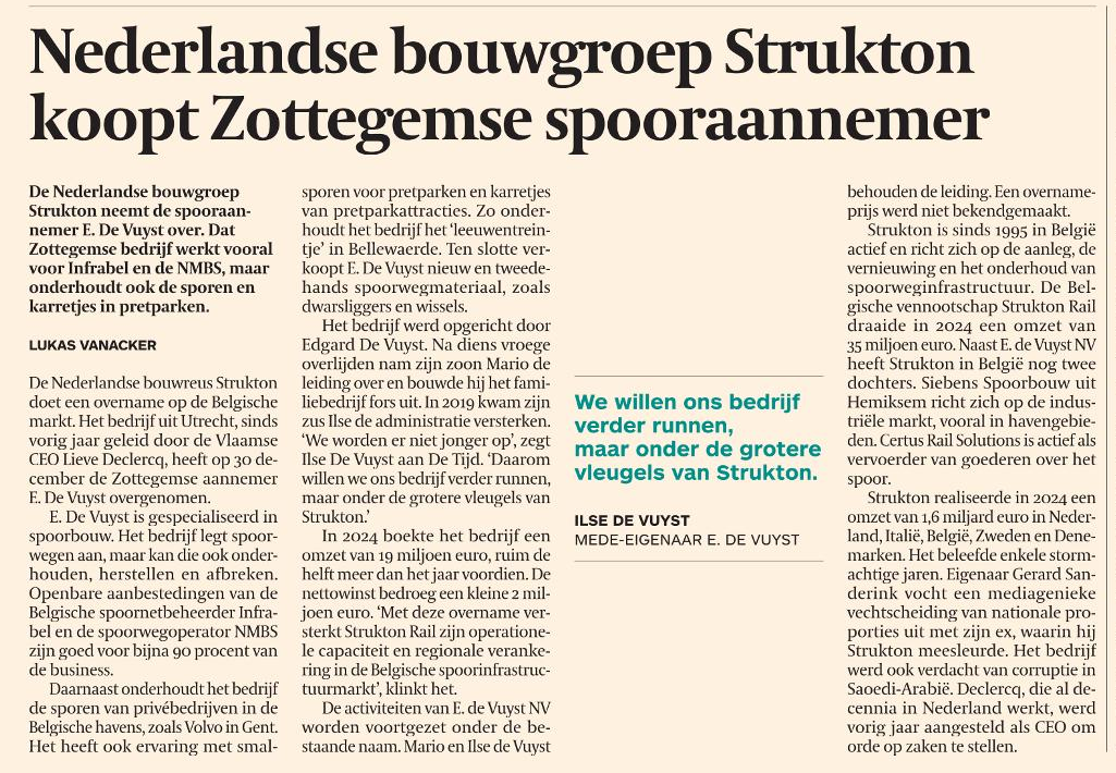 Strukton Rail NV heeft op 30 december 2025 de Belgische spooraannemer E. de Vuyst NV, gevestigd in Zottegem, overgenomen.